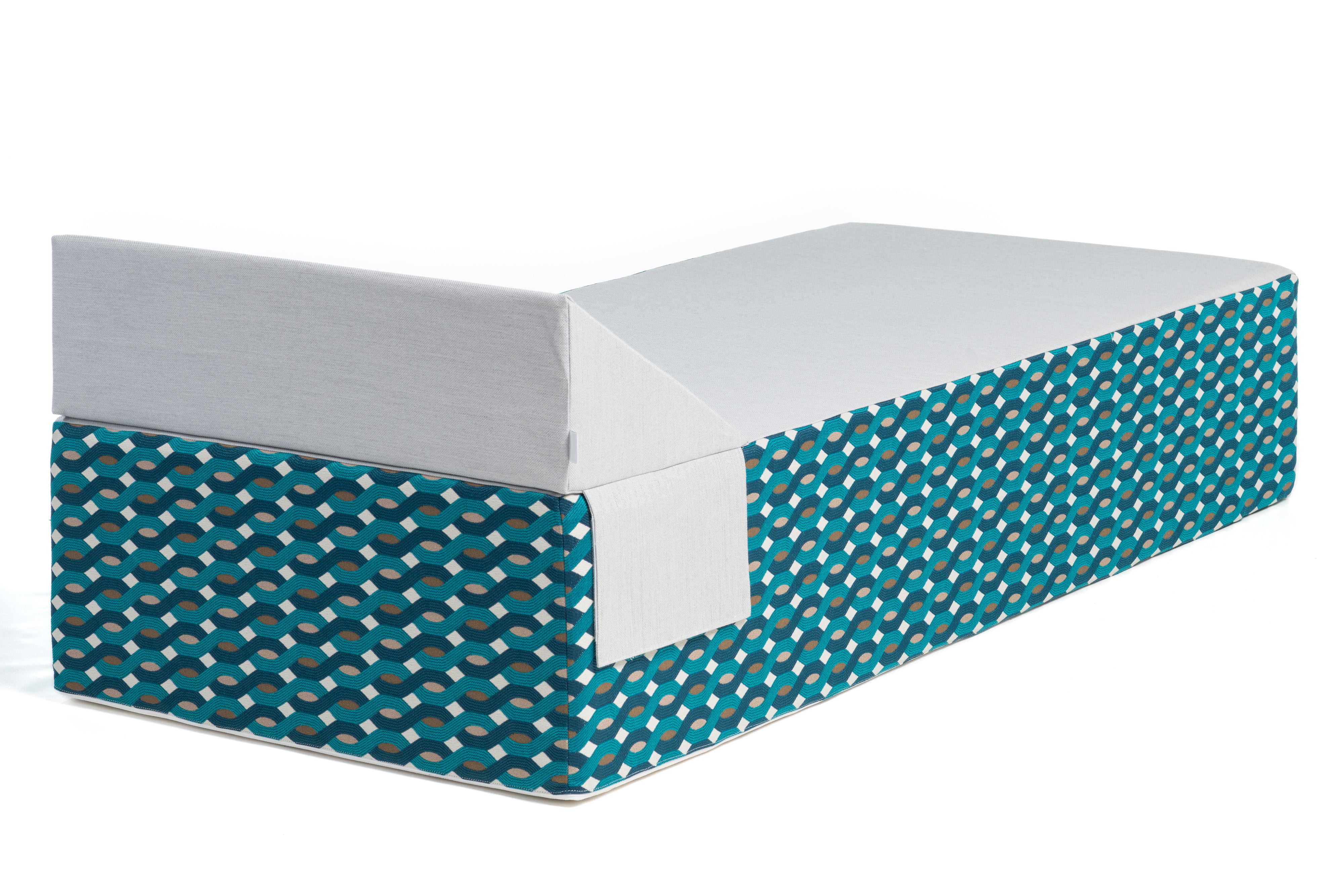 Mousse HR recouverte d'une housse en Batyline waterproof grise au dessus et des bandes du luxueux tissu Elitis spécial outdoor sur les côtés.