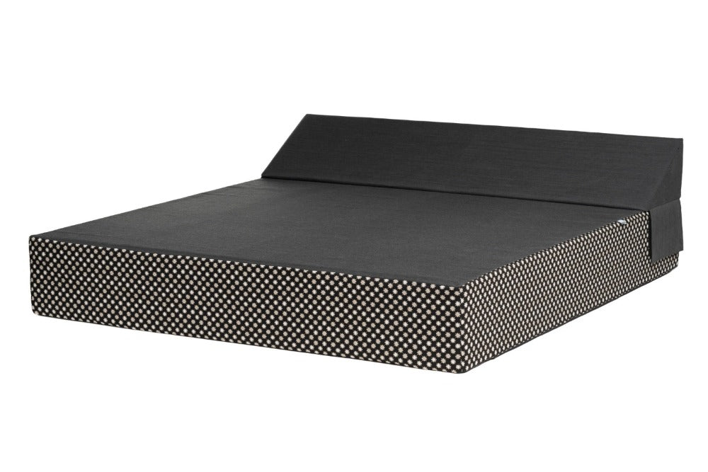 Mousse HR recouverte d'une housse en Batyline waterproof S. Ferrari sur le dessus ainsi que la têtière. Le dessous est recouvert d'une Batyline iso S. Ferrari, une grille respirante et anti abrasion. Le bed est entouré de bandes du luxueux tissu Elitis spécial extérieur.