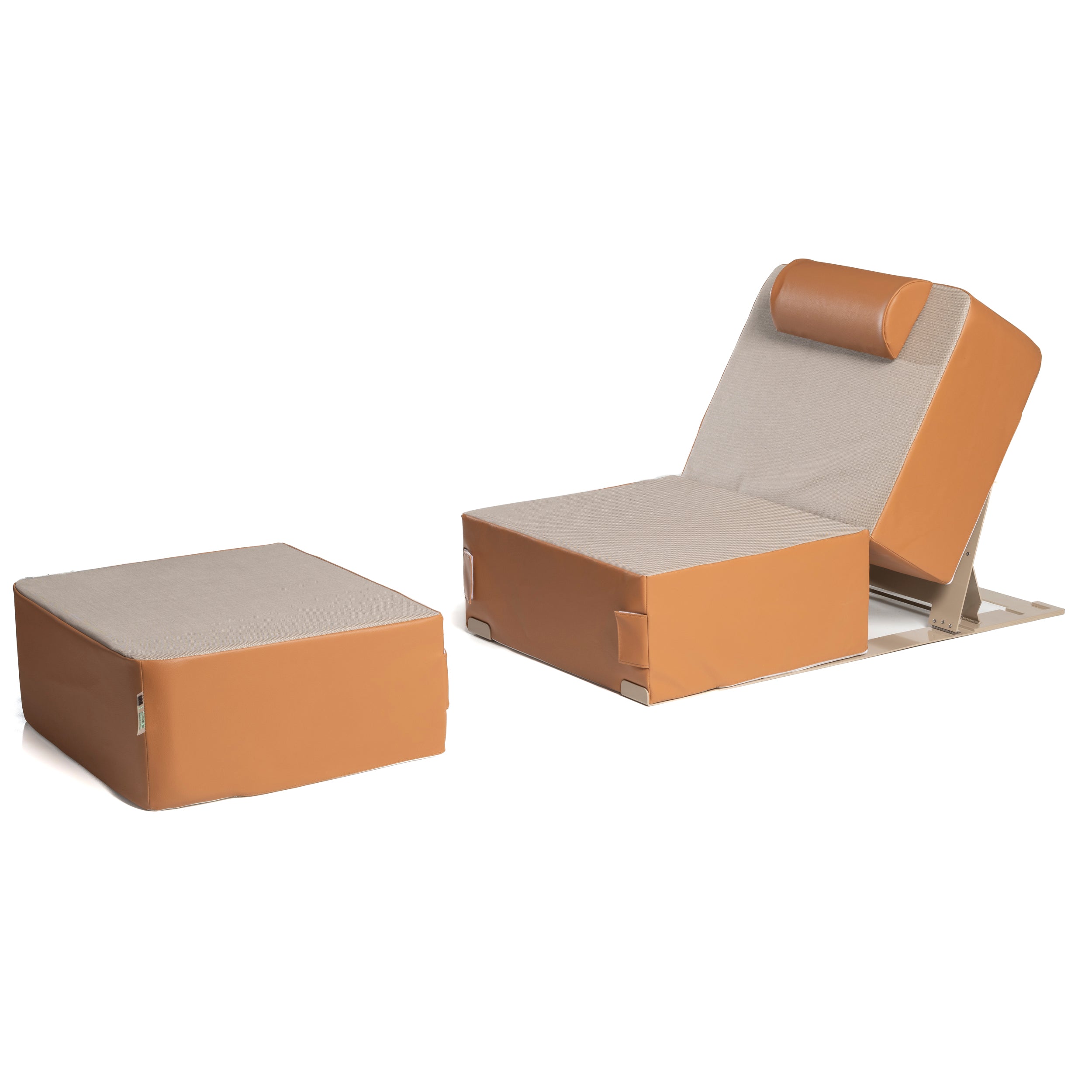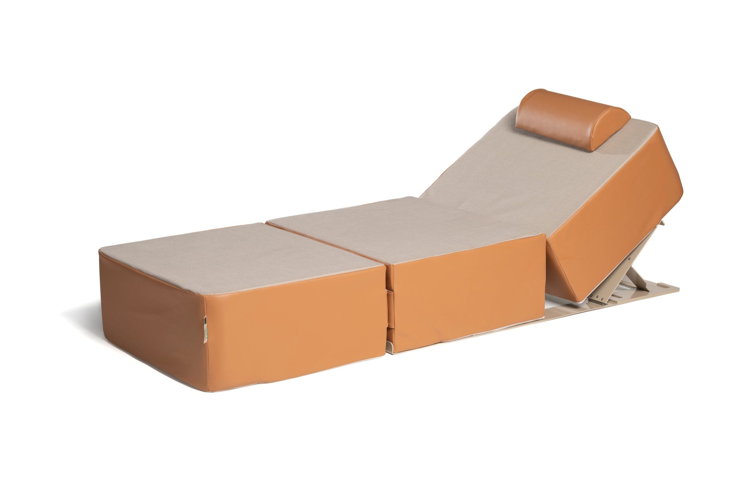 Mousse HR recouverte d’une housse en Batyline S. Ferrari waterproof beige sur le dessus et un tissu Stamskin cognac sur les côtés. Le dessous est recouvert d’une batyline iso S. Ferrari, une grille respirante et anti-abrasion. Appui tête en forme demi lune, attaché par velcro.
