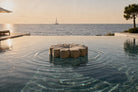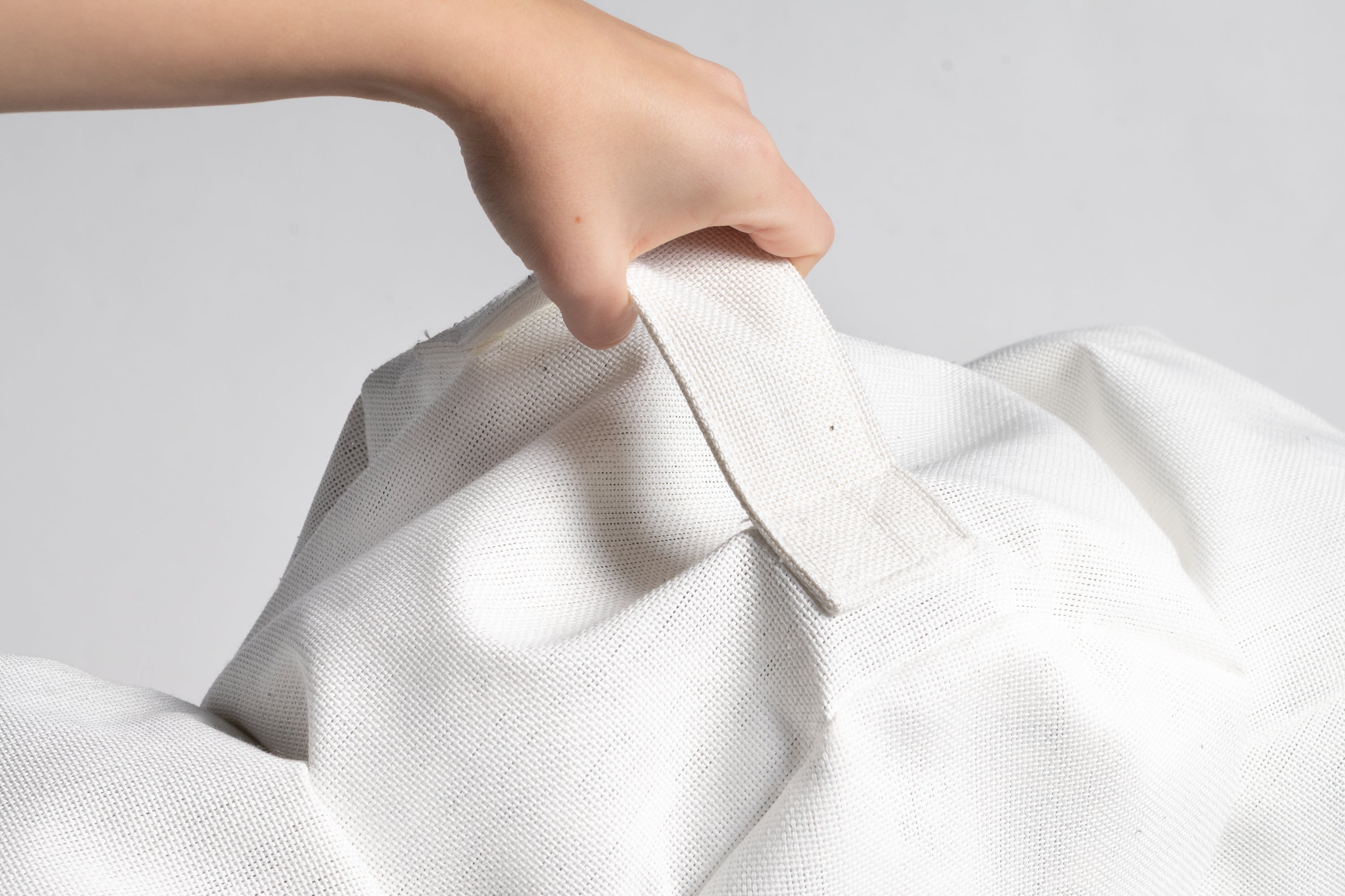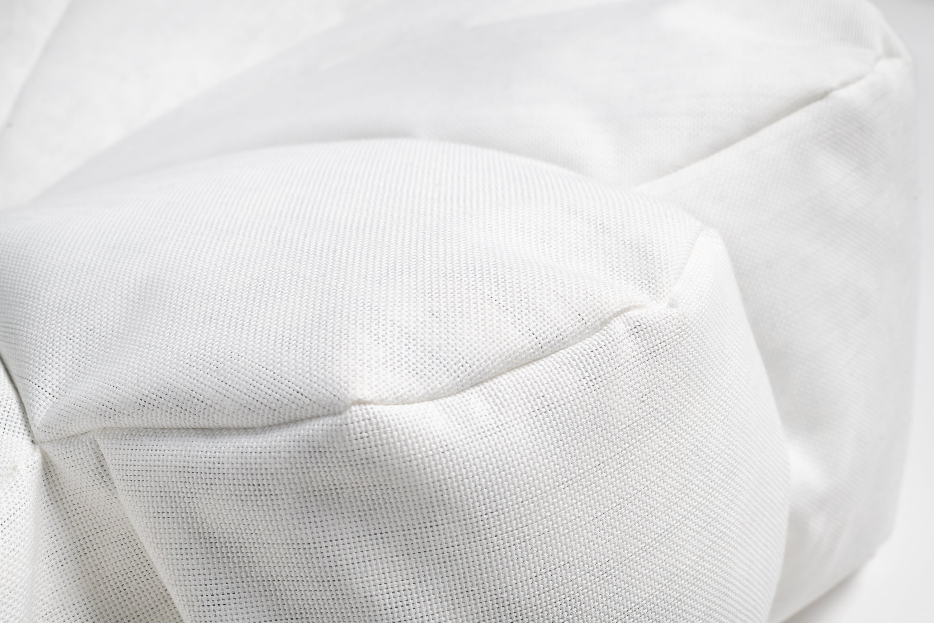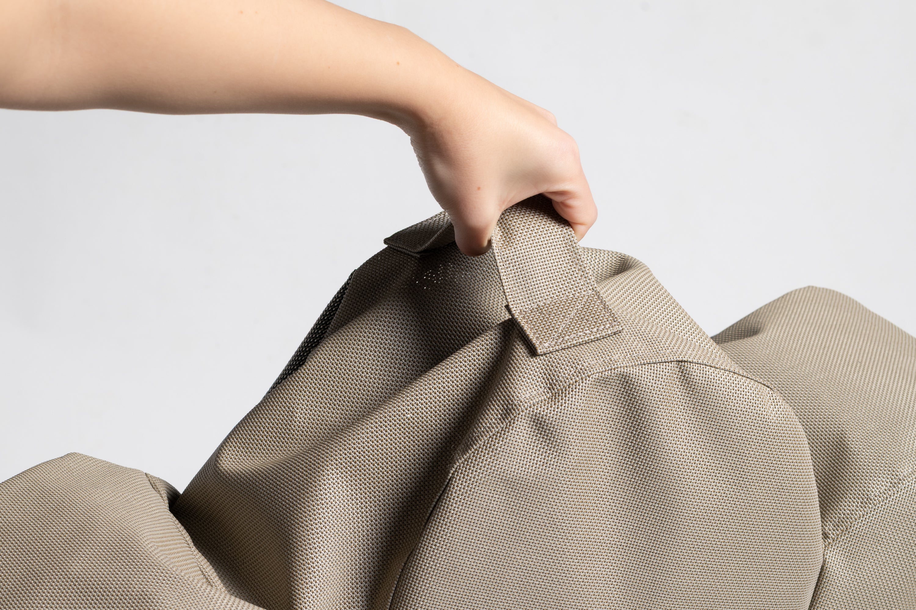 Coussin flottant en garnissage de billes recouvert d'une housse en Batyline waterproof S. Ferrari sur le côté et un tissu ajouré en dessous.