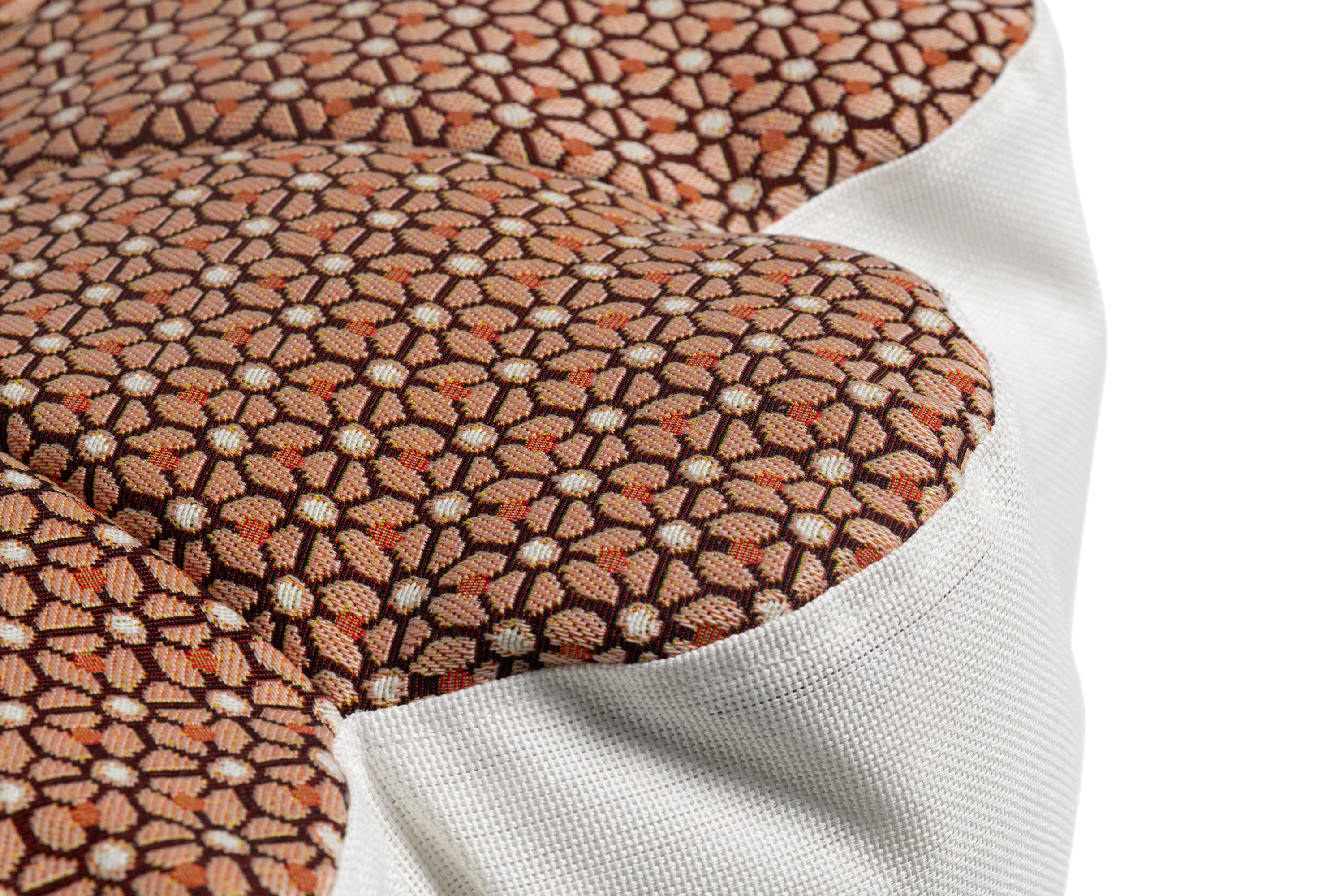 Pouf en garnissage flocons recouvert du luxueux tissu Elitis spécial extérieur sur le dessus, d'une housse en Batyline waterproof S. Ferrari sur le côté et un tissu ajouré en dessous.