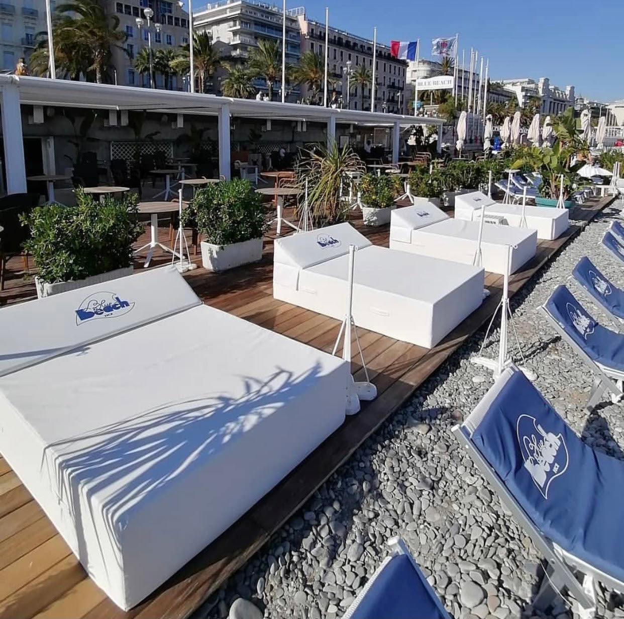Nos Beds Paloma et nos matelas de plage professionnels, sur la plage de galets du Blue Beach !