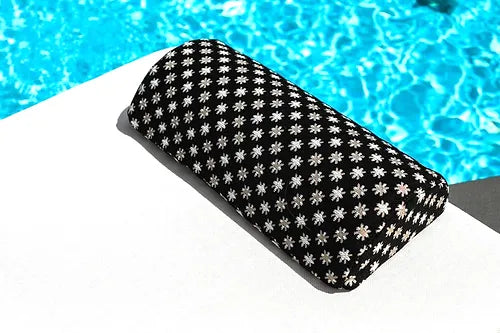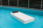 Un matelas 2 en 1, en mousse et en tissu batyline waterproof blanche avec sa têtière en tissu Elitis, pour en profiter sur l'eau et sur le bord de votre piscine.